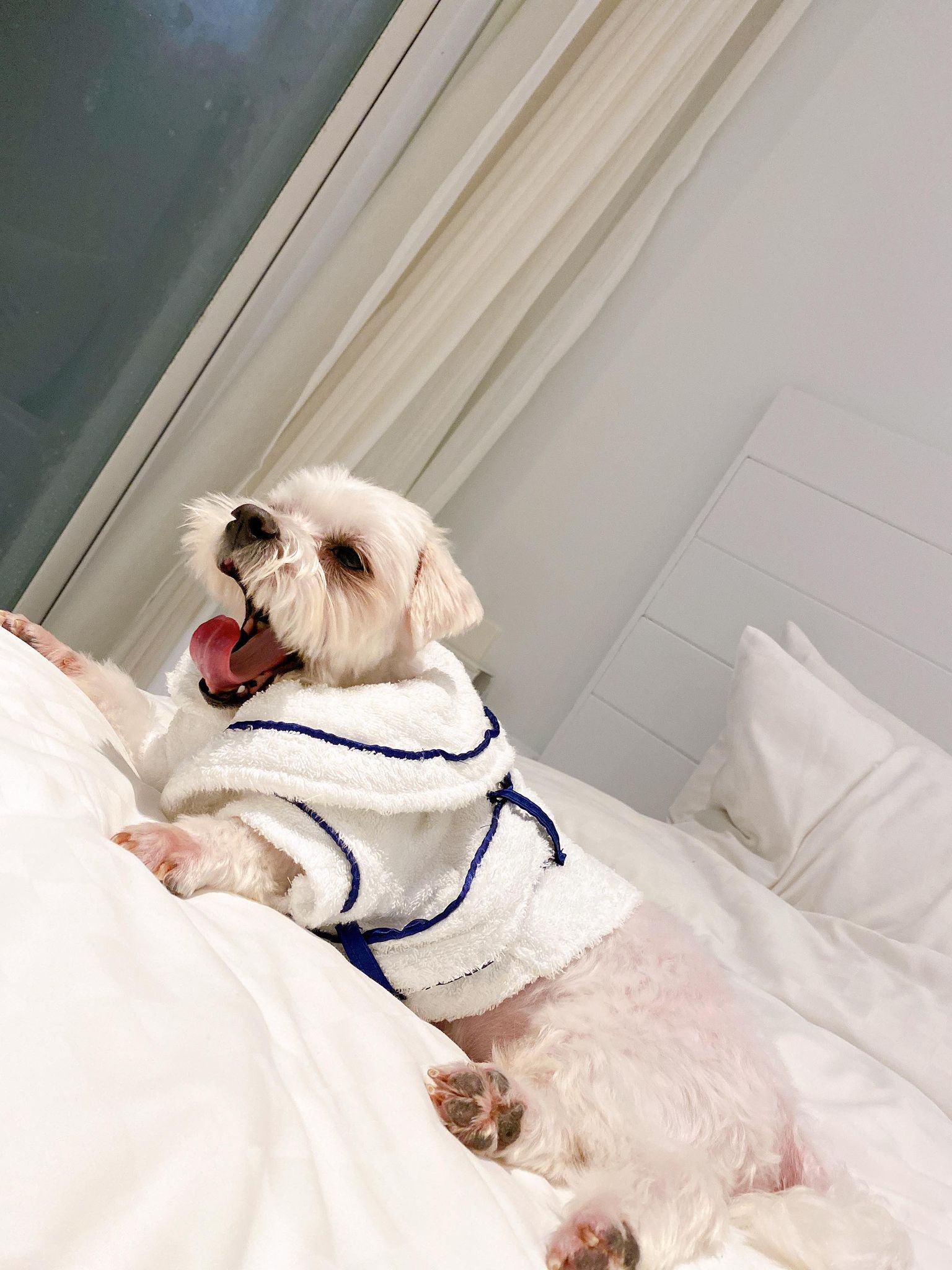 民宿除了提供毛孩家長的浴袍外,也有提供毛孩浴袍,寶寶穿著民宿提供的小