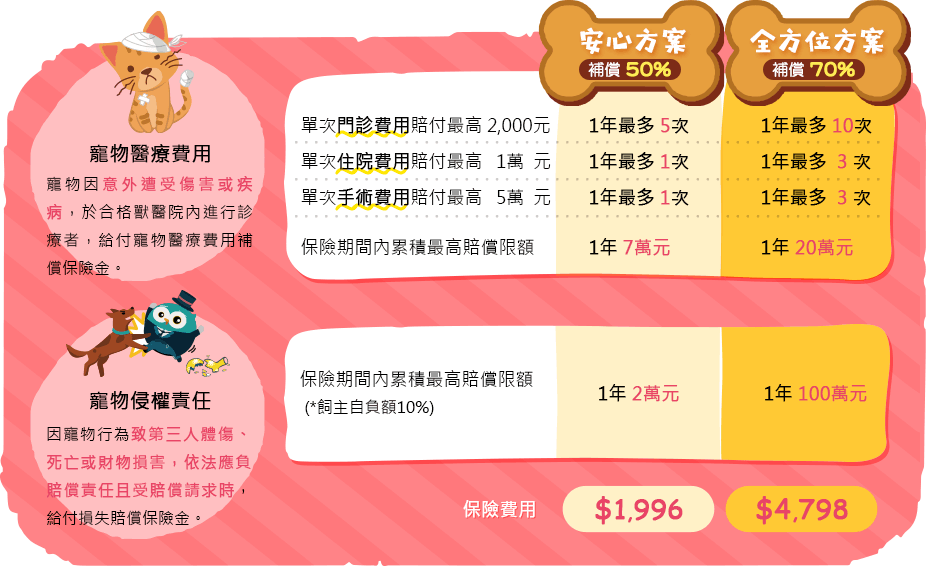差別是醫療費用的補償趴數跟補償次數,寵物侵權責任的賠償限額額度也不一樣,