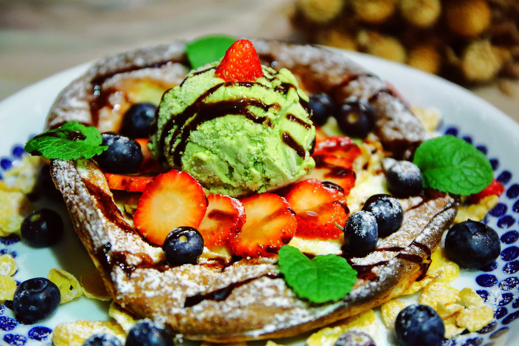 中心濕潤軟綿,外層有著雞蛋糕般的酥鬆香脆,搭配搭配新鮮的草莓並撒上如細雪般的糖粉,