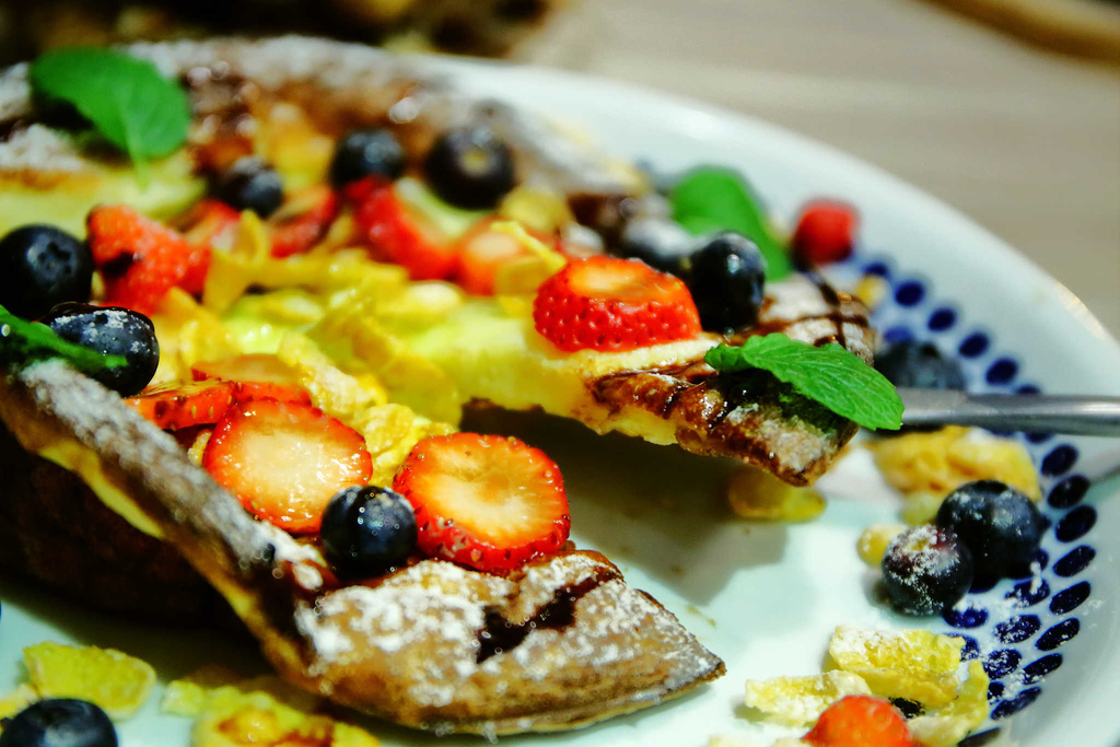 中心濕潤軟綿,外層有著雞蛋糕般的酥鬆香脆,搭配搭配新鮮的草莓並撒上如細雪般的糖粉,