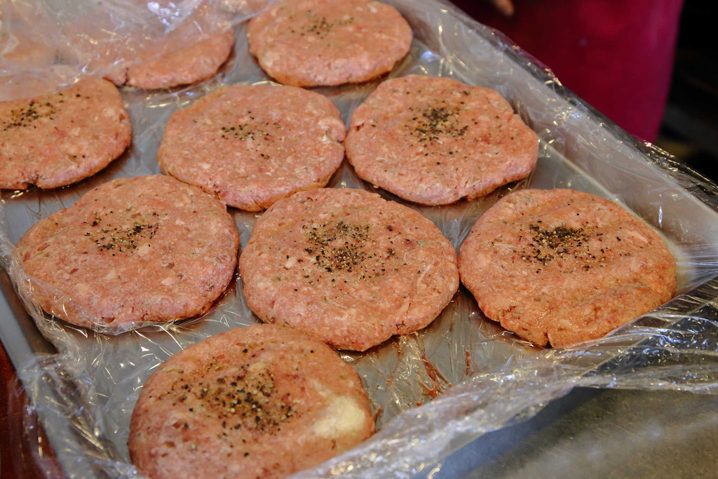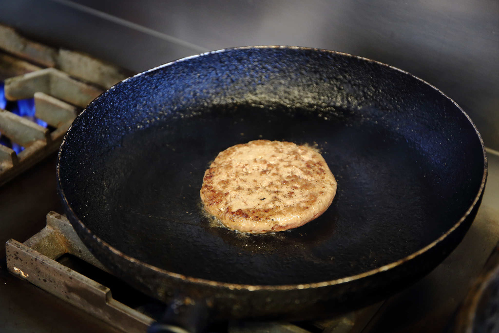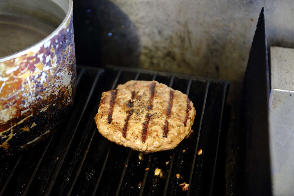 漢堡排煎時溢出粉紅肉汁還沒熟,流出透明汁液即可起鍋,再放到一旁將表面煎烤得金黃焦香
