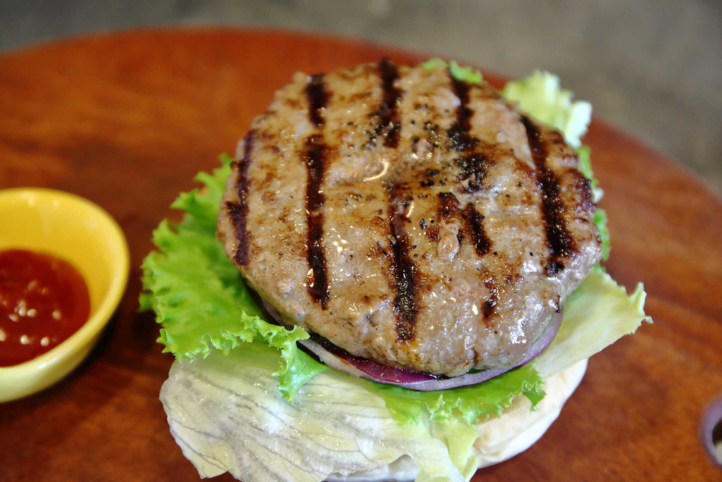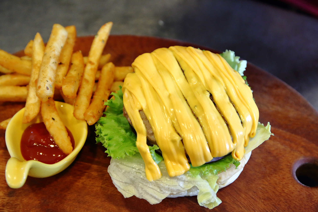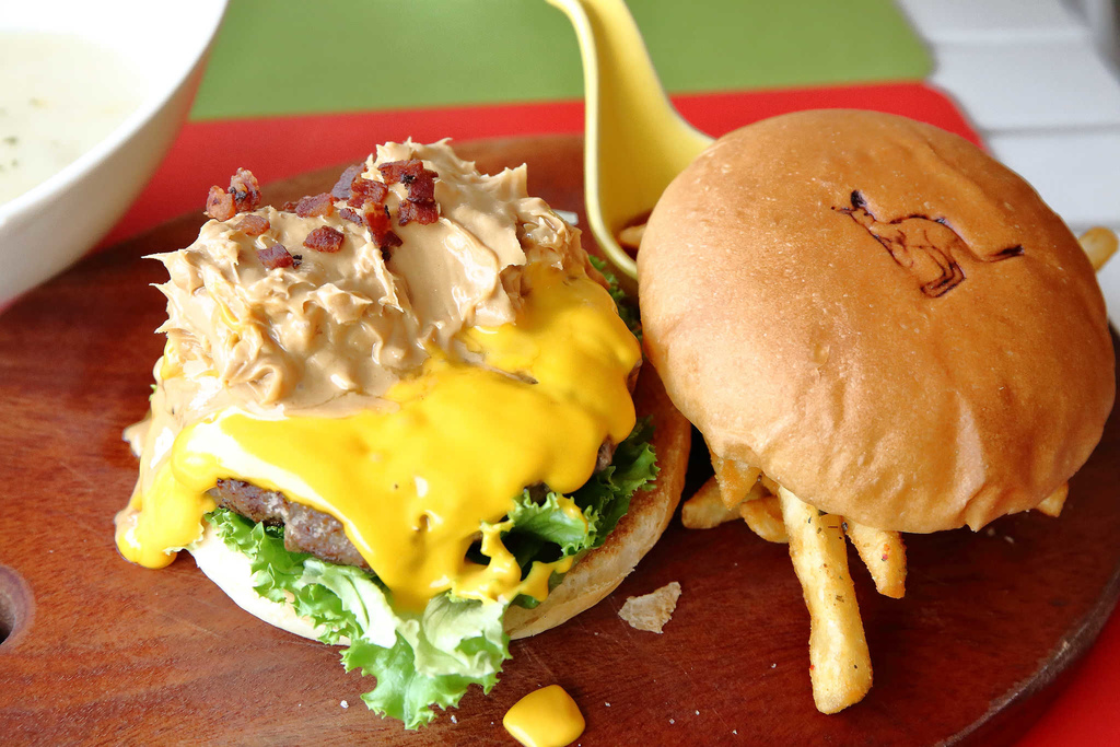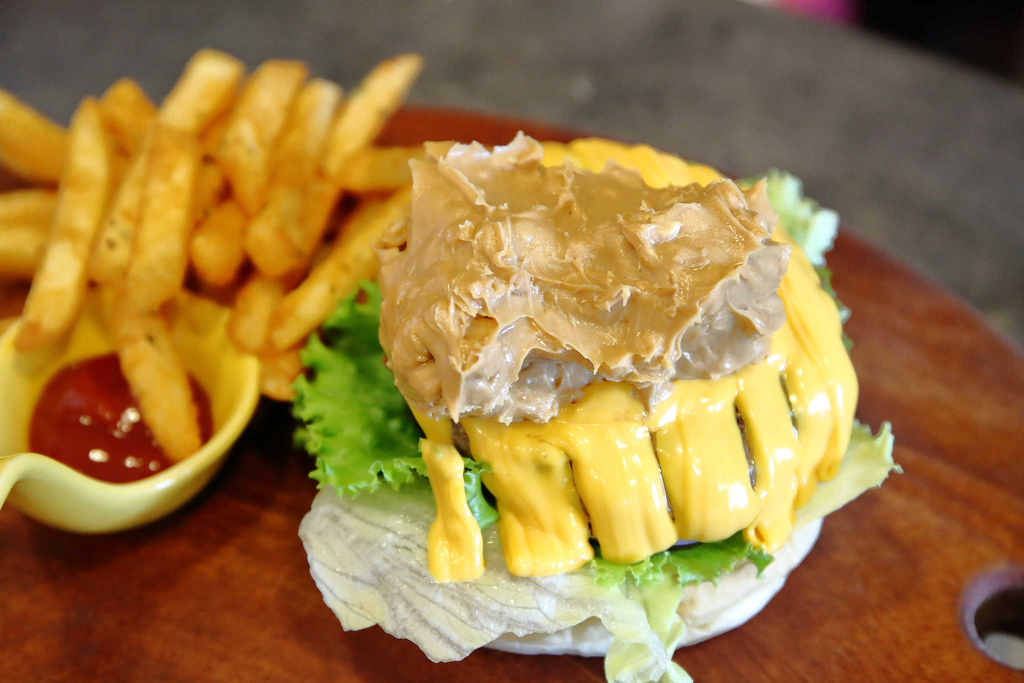 果然自製的牛肉漢堡排多汁又紮實,肉汁的香氣、融化的起司搭配花生醬,鹹鹹甜甜難以抵擋啊!
