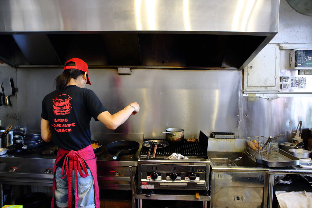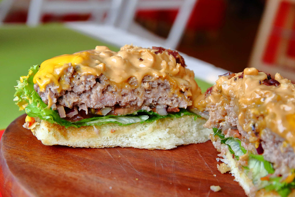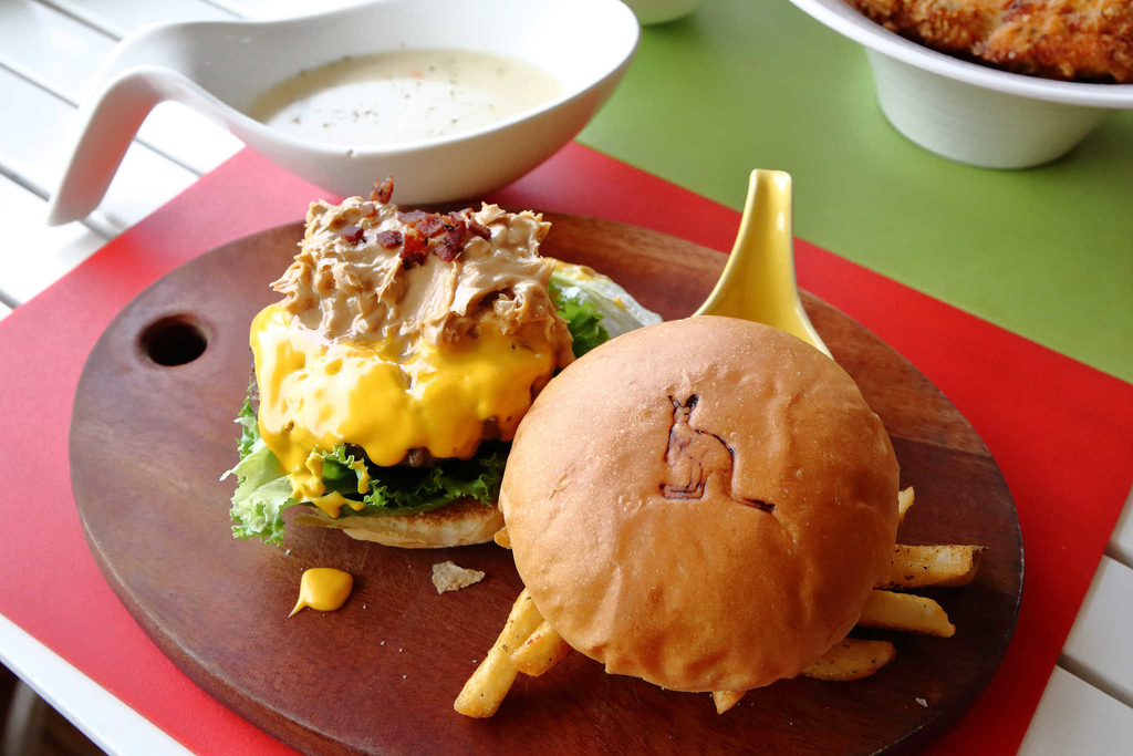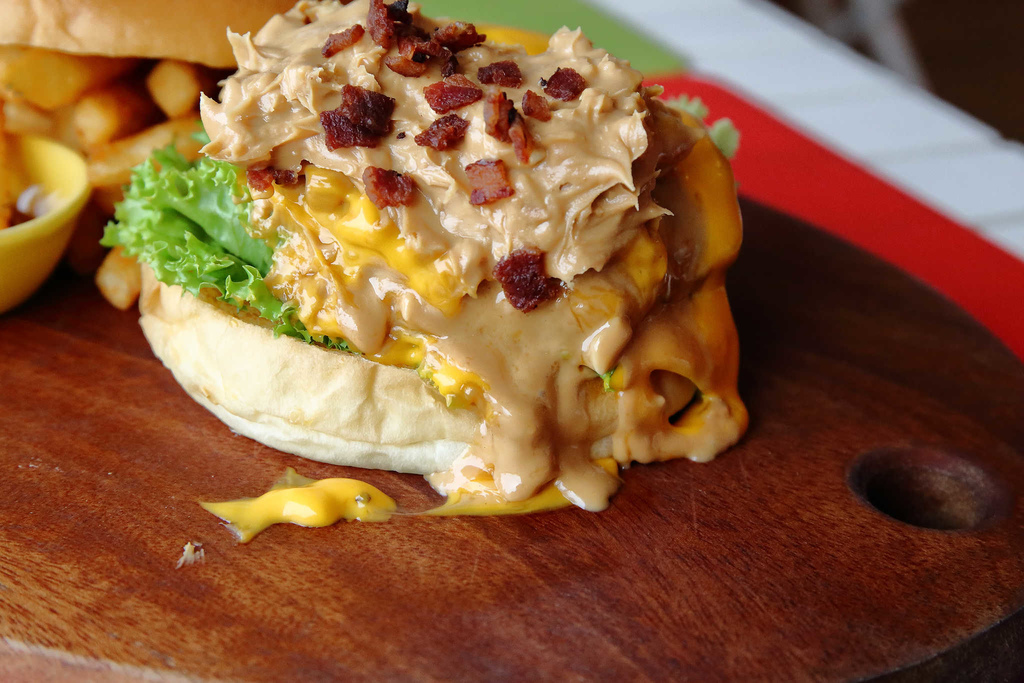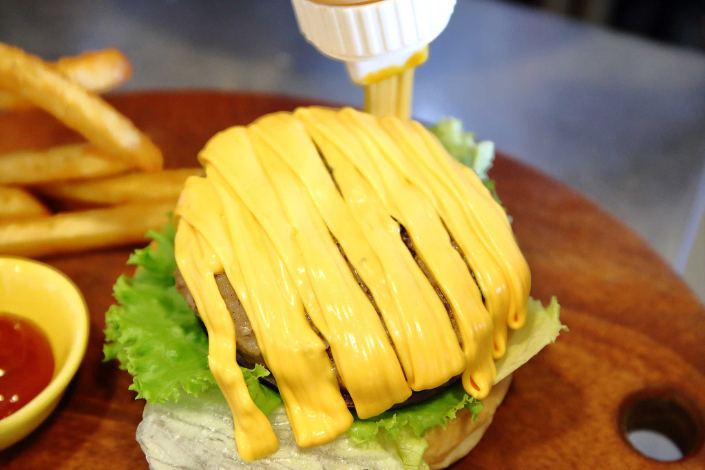 果然自製的牛肉漢堡排多汁又紮實,肉汁的香氣、融化的起司搭配花生醬,鹹鹹甜甜難以抵擋啊!