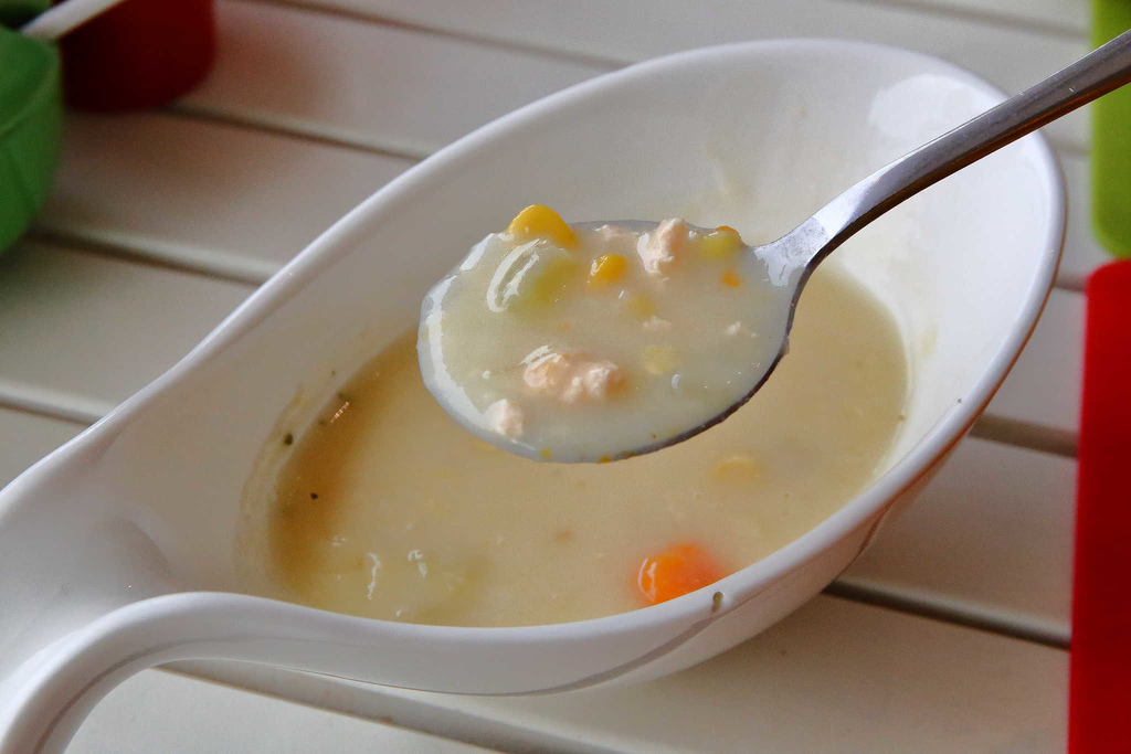 看起來非常豐富,有洋蔥、雞肉、紅蘿蔔、玉米粒等等,香濃可口,充滿玉米甜香味