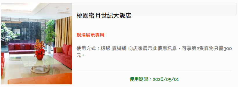 寵遊優惠券 全台寵遊特約店家適用 現領現用! 優惠券首頁 優惠券查詢 類型 住宿 餐廳 特約店家 優惠券首頁 優惠券查詢 類型 住宿 餐廳 特約店家 寵遊專案 花蓮藍色貓頭鷹民宿 訂房享9折 立即領優惠 寵遊專案 川御燒肉專門店• 職人碳烤 毛孩加菜專案 立即領優惠 寵遊專案 墾丁福華渡假飯店-小灣會館 享房價85折優惠 立即領優惠 寵遊專案 林小狗旅宿 海邊時尚旅店預訂9折 立即領優惠 分類 全部優惠券 住宿 到店展示 線上預約 餐廳 川御燒肉專門店 現場展示專用 使用方式:透過 寵遊網 向店家展示此優惠訊息,可招待主廚特餐乙份。 More Less 使用期限:2025/12/31 寵遊優惠券 免下載 直接領取! 最新優惠券 我們擁有所有的優惠券 專屬優惠 定期更新 優惠券定期更新 特約店家 寵物友善特約店 改變你和毛孩的生活 從這裡開始 查看所有商品