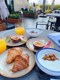 此次入住加購了金普頓酒店的早餐,分量不多,但口味獨特且多樣,除了主餐外還有提供水果、果汁、優格、可頌,咖啡。在這用餐時刻,大家都紛紛帶著毛孩上12樓用餐,此起彼落的狗叫聲,聽起來有點悅耳,能跟這麼多毛孩一起用餐真的很開心~