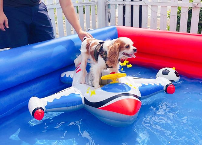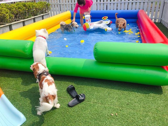 室外則有狗狗喜歡的草坪、小游泳池、溜滑梯!