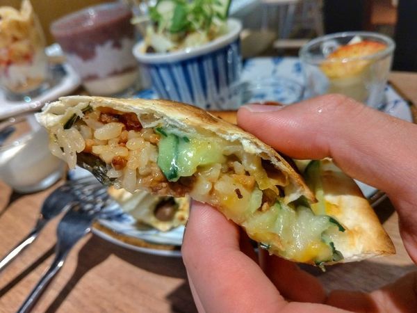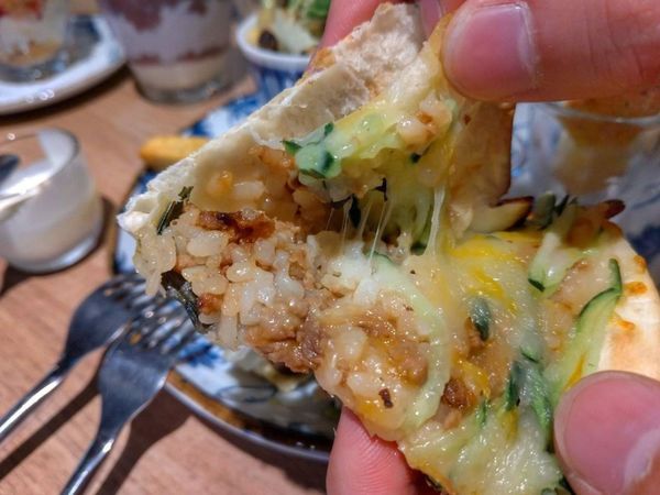 烤到微焦的表皮,邊邊酥脆,中間稍微有麵皮厚度和嚼勁,切成方便入口的三角形,裡面包著餡料和起司焗烤飯,粒粒白飯吸附口味醬汁,不會太乾也不會軟爛