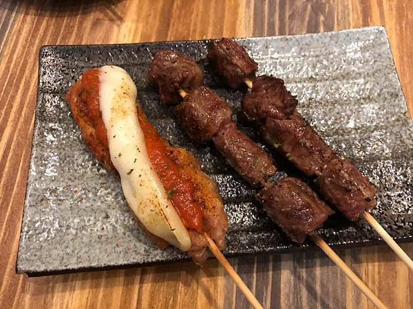 第二個上場的是也是很讓人驚艷的烤串左邊是起司雞肉串($60),右邊是牛肋條($90)