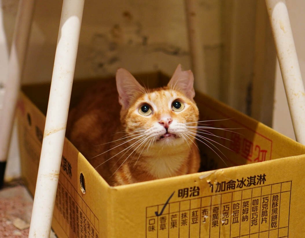 愛吃的他會悄悄的從紙箱跳出來,想要靠近 貓 群跟大家一起用餐